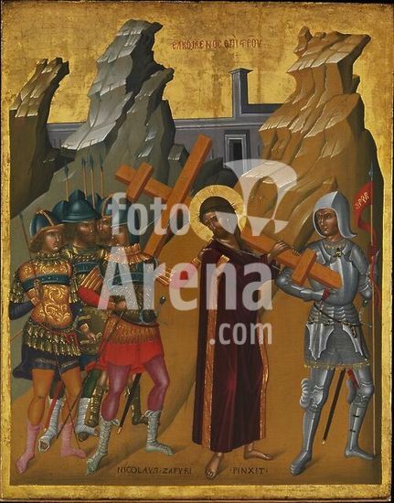 alb3674411 Christ Bearing the Cross. Artist: Nicolaos Tzafouris (Greek, ca. 1455-1500/1501). Dimensions: 27 1/4 x 21 1/2 in. (69.2 x 54.6 cm).Nicholaos Tzafouris was one of the many icon painters working in the city of Candia (now Iraklion) in Crete at the time when Crete was under the control of Venice. The combination of Byzantine and Latin elements seen in many Cretan icons was well received locally and in Italy. The Greek inscription on this icon describes a Byzantine icon type in which soldiers drag Christ to Golgotha. The image here, however, is western in type, showing Christ carrying the cross to Golgotha. The soldier before Christ wears contemporary Italian armor, and those behind him wear Byzantine or Cretan armor. Museum: Metropolitan Museum of Art, New York, USA. Author: Nicolaos Tzafouris.
