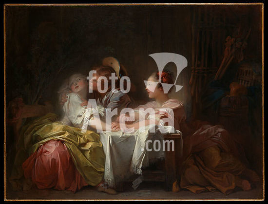 alb3675059 The Stolen Kiss. Artist: Jean Honoré Fragonard (French, Grasse 1732-1806 Paris). Dimensions: 19 x 25 in. (48.3 x 63.5 cm). Date: ca. 1760.One of a few highly finished works painted by Fragonard during his first Italian sojourn, the canvas was painted between 1756 and 1761. It belonged to the Bailli de Bréteuil, who was ambassador to Rome from Malta. While the figure group reminds us that Fragonard was trained under Boucher, the intensity, the color harmonies, and the warm, dark atmosphere are his own. Museum: Metropolitan Museum of Art, New York, USA.