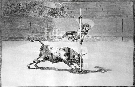 alb3675545 Plate 20 from the 'Tauromaquia':The agility and audacity of Juanito Apiñani in [the ring] at Madrid. Artist: Goya (Francisco de Goya y Lucientes) (Spanish, Fuendetodos 1746-1828 Bordeaux). Dimensions: Plate: 9 5/8 × 13 7/8 in. (24.5 × 35.3 cm)11 in. × 15 3/16 in. (28 × 38.5 cm). Series/Portfolio: La Tauromaquia. Date: 1816.16.4.2 ; 16.4.3; 16.4.4; are all on paper with No. 1 watermark.Under microscopic examination it is clear that the lines and aquatintare finer than in the impressions from the MMA complete set (21.19.1-33) printed on paper that appears to be uniformly Serra make, even when the watermark is not present. Museum: Metropolitan Museum of Art, New York, USA.