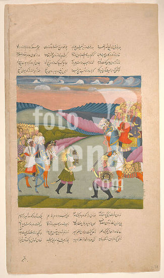 alb3676470 "Ali and Omar on the Battlefield", Folio from a Hamla-yi Haidari. Author: Muhammad Rafi Khan (Indian, died 1711). Dimensions: H: 19 5/8 in (49.8 cm) x W: 11 3/16 in (28.4 cm). Date: ca. 1820. Museum: Metropolitan Museum of Art, New York, USA.