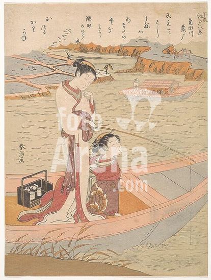 alb3678264 Sumidagawa no rakuganWild Geese Flying Down the Sumida River. Artist: Suzuki Harunobu (Japanese, 1725-1770). Culture: Japan. Dimensions: 11 1/4 x 8 3/8 in. (28.6 x 21.3 cm). Date: ca. 1769. Museum: Metropolitan Museum of Art, New York, USA.