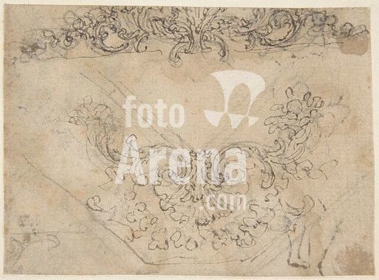 alb3678722 Designs for a Palmette Motif with Tendrils (recto); studies for a Male Figure and Decorative Sculpture (verso). Artist: Giovanni Battista Foggini (Italian, Florence 1652-1725 Florence). Dimensions: sheet: 2 13/16 x 3 7/8 in. (7.2 x 9.8 cm). Date: 1652-1725. Museum: Metropolitan Museum of Art, New York, USA.
