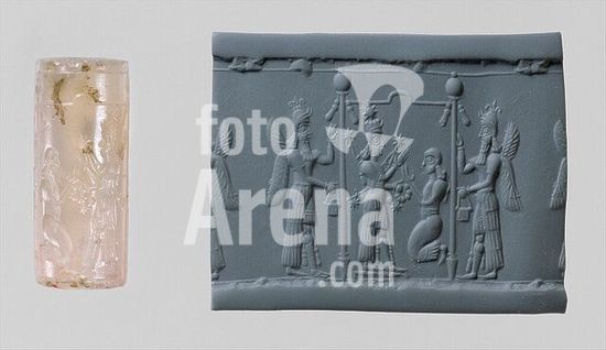 alb3680812 Cylinder seal. Culture: Babylonian. Dimensions: H. 3 cm x Diam. 1.4 cm. Date: ca. 18th-16th century B.C..Although engraved stones had been used as early as the seventh millennium B.C. to stamp impressions in clay, the invention in the fourth millennium B.C. of carved cylinders that could be rolled over clay allowed the development of more complex seal designs. These cylinder seals, first used in Mesopotamia, served as a mark of ownership or identification. Seals were either impressed on lumps of clay that were used to close jars, doors, and baskets, or they were rolled onto clay tablets that recorded information about commercial or legal transactions. The seals were often made of precious stones. Protective properties may have been ascribed to both the material itself and the carved designs. Seals are important to the study of ancient Near Eastern art because many examples survive from every period and can, therefore, help to define chronological phases. Often preserving imagery no longer extant in any other medium, they serve as a visual chronicle of style and iconography.The modern impression of the seal is shown so that the entire design can be seen. This hematite cylinder seal is carved with the images of two deities, identifiable by their horned headgear. The seated deity holds a rod with an emblem or recarving at the top and wears a long dress; the standing god is dressed in a shorter tunic and rests one foot on a horned animal. Based on his attributes, the standing figure on the right may be the god Amurru.Amurru, the eponymous god of the Amorite peoples (Akkadian amurru), began to be represented on cylinder seals in the early second millennium B.C. It is likely that the god was created by the urban elite of southern Mesopotamia as a personification of the semi-nomadic Amorite tribes whose name he shared. The symbols associated with this god - the horned animal, crooked staff, and in some cases distinctive headgear or a stylized mountain - all emphasize his foreignness. On this cylinder, Amurru is shown in an inferior position standing before an enthroned (and traditionally-garbed) deity.Cylinder seals in the ancient Near East served as both a kind of amulet and as a mark of ownership or identification. The representation of Amurru on this cylinder may have appealed to its owner either as a Mesopotamian symbol of Amorite identity or, perhaps more likely, as a protective device, since the god came to be associated with exorcism and healing. Museum: Metropolitan Museum of Art, New York, USA.