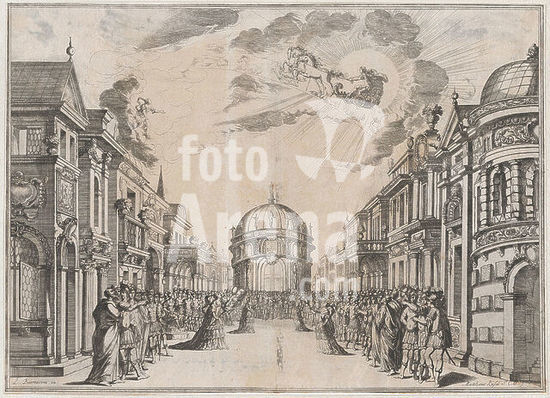 alb3681097 A large gathering of people in the street as a goddess races across the sky in a chariot led by four horses; set design from 'Il Fuoco Eterno'. Artist: Mathäus Küsel (German, 1621-1682); after Ludovico Ottaviano Burnacini (Italian, Mantua 1636-1707 Vienna (active Austria)). Dimensions: Sheet (Trimmed): 11 15/16 × 16 1/2 in. (30.3 × 41.9 cm). Date: 1674.One of twelve plates depicting the stage sets designed by Lodovico Burnacini for 'Il Fuoco Eterno Custodito Dalle Vestali', an opera celebrating the birth of Maria Anna Antonia, Archduchess of Austria in 1672. The Archduchess was the daughter of Emperor Leopold I and his second wife Claudia Felicitas, heiress of Tirol. Composed by Antonio Draghi with a libretto by Nicoló Minato, the opera was performed in the Hoftheater in Vienna on October 30, 1674. Museum: Metropolitan Museum of Art, New York, USA.