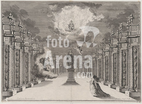 alb3682132 A woman standing on the right side of a road lined with columns; at center a statue of a female with cupid flying nearby; to the left, a woman emerging from the clouds as another sits among flames above; set design from 'Il Fuoco Eterno'. Artist: Mathäus Küsel (German, 1621-1682); after Ludovico Ottaviano Burnacini (Italian, Mantua 1636-1707 Vienna (active Austria)). Dimensions: Sheet (Trimmed): 12 1/16 × 16 9/16 in. (30.7 × 42.1 cm). Date: 1674.One of twelve plates depicting the stage sets designed by Lodovico Burnacini for 'Il Fuoco Eterno Custodito Dalle Vestali', an opera celebrating the birth of Maria Anna Antonia, Archduchess of Austria in 1672. The Archduchess was the daughter of Emperor Leopold I and his second wife Claudia Felicitas, heiress of Tirol. Composed by Antonio Draghi with a libretto by Nicoló Minato, the opera was performed in the Hoftheater in Vienna on October 30, 1674. Museum: Metropolitan Museum of Art, New York, USA.