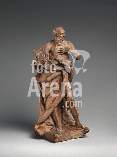 alb3683979 Apostle (Saint Matthew?). Culture: Italian. Dimensions: Overall (confirmed): 17 1/2 × 8 5/8 × 6 7/8 in. (44.5 × 21.9 × 17.5 cm). Date: 1730s.This vigorously modeled statuette portrays an Apostle, possibly Saint Matthew. He holds an open book, one of his symbols, in his right hand, and his left is pressed against his chest, almost evocative of his call from Jesus. The terracotta bozzetto exemplifies a different way of fashioning clay, being in between a clay sketch and a smooth model. The handling of the clay is masterful. Particularly engaging is the spiky head, quickly modeled with few secure strokes and framed by sparse hair. The Evangelist's powerful stride and arrangement of the heavy mantle, with its deep edgy folds, animate the figure and impart a sense of monumentality and command of space typical of Roman sculpture at the time. Museum: Metropolitan Museum of Art, New York, USA.