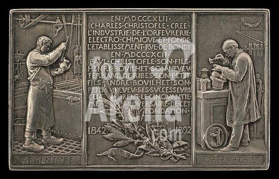alb3696875 Fiftieth Anniversary of the Christofle Company, 1842-1892 [reverse]. Dated: 1892. Dimensions: overall: 6 x 9.4 cm (2 3/8 x 3 11/16 in.). Medium: silvered bronze. Museum: National Gallery of Art, Washington DC. Author: Louis-Oscar Roty.