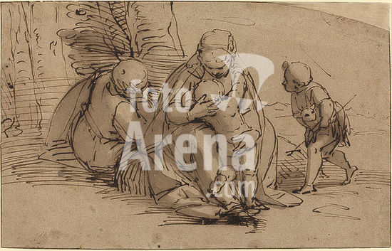 alb3701152 Holy Family with Infant Saint John. Dimensions: overall (approximate): 26.6 x 41.8 cm (10 1/2 x 16 7/16 in.). Medium: pen and brown ink with brown wash on brown paper. Museum: National Gallery of Art, Washington DC. Author: LUCA CAMBIASO.