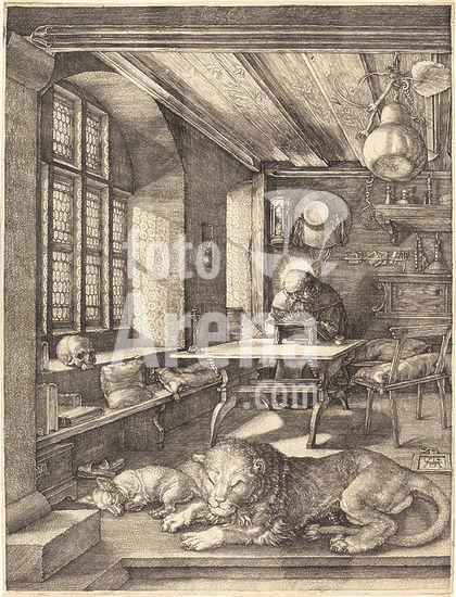 alb3707057 Saint Jerome in His Study. Dated: 1514. Dimensions: sheet (trimmed to plate mark): 25.4 x 19 cm (10 x 7 1/2 in.). Medium: engraving on laid paper. Museum: National Gallery of Art, Washington DC. Author: ALBRECHT DURER.