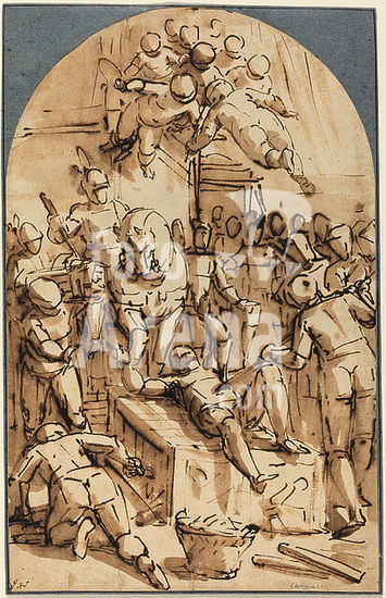 alb3707140 The Martyrdom of Saint Lawrence. Dimensions: sheet (lunette): 38.8 x 24.5 cm (15 1/4 x 9 5/8 in.). Medium: pen and brown ink with brown wash on laid paper. Museum: National Gallery of Art, Washington DC. Author: LUCA CAMBIASO.