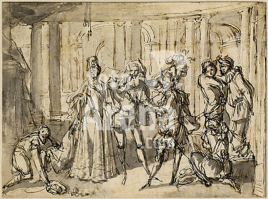alb3717570 A Performance by the Commedia dell'Arte. Dated: c. 1710. Dimensions: overall: 15.9 x 21.4 cm (6 1/4 x 8 7/16 in.). Medium: pen and brown ink with gray wash on laid paper. Museum: National Gallery of Art, Washington DC. Author: CLAUDE GILLOT.