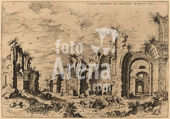 alb3734344 The Baths of Diocletian. Dated: 1550. Dimensions: sheet (trimmed to plate mark): 23.4 x 33.6 cm (9 3/16 x 13 1/4 in.). Medium: etching on laid paper. Museum: National Gallery of Art, Washington DC. Author: Hieronymus Cock.