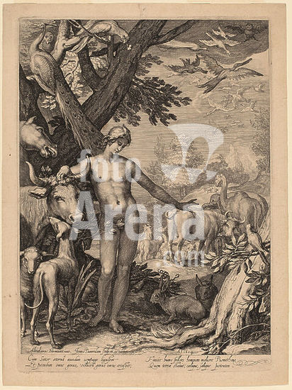alb3735265 Adam Naming the Animals. Dated: 1604. Dimensions: plate: 27.5 x 19.7 cm (10 13/16 x 7 3/4 in.) sheet: 29.6 x 22.3 cm (11 5/8 x 8 3/4 in.). Medium: engraving on laid paper. Museum: National Gallery of Art, Washington DC. Author: Jan Pietersz Saenredam after Abraham Bloemaert.