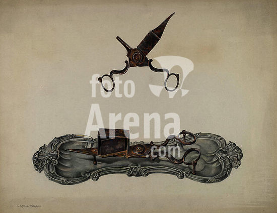 alb3736042 Pewter Tray and Snuffers. Dated: c. 1938. Dimensions: overall: 26.8 x 34.6 cm (10 9/16 x 13 5/8 in.) Original IAD Object: tray: 10" long; 3 3/16" wide; snuffer: 6 5/8" long. Medium: watercolor and graphite on paper. Museum: National Gallery of Art, Washington DC. Author: Carmel Wilson.