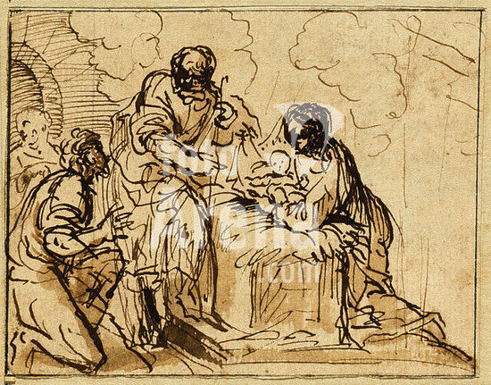 alb3736925 The Adoration of the Shepherds. Dimensions: mount: 46.1 x 29.4 cm (18 1/8 x 11 9/16 in.) sheet: 8.2 x 10.7 cm (3 1/4 x 4 3/16 in.). Medium: pen and brown ink with brown wash on laid paper. Museum: National Gallery of Art, Washington DC. Author: Agostino Masucci.