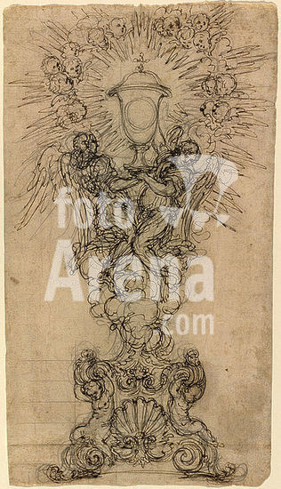 alb3739422 A Monstrance with Two Angels Supporting a Chalice. Dimensions: overall: 42.3 x 23.7 cm (16 5/8 x 9 5/16 in.). Medium: black chalk and pen and brown ink, partially squared in black chalk, on laid paper. Museum: National Gallery of Art, Washington DC. Author: Giovanni Battista Foggini.