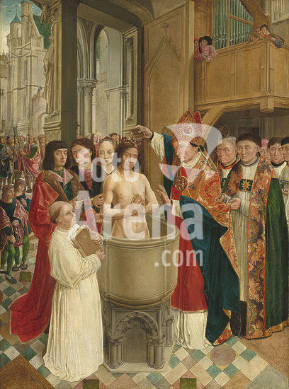 alb3746835 The Baptism of Clovis. Dated: c. 1500. Dimensions: painted surface: 61.5 x 45.5 cm (24 3/16 x 17 15/16 in.) overall (panel): 63.3 x 46.7 cm (24 15/16 x 18 3/8 in.) framed: 82.07 × 66.36 × 9.21 cm (32 5/16 × 26 1/8 × 3 5/8 in.). Medium: oil on panel. Museum: National Gallery of Art, Washington DC. Author: Master of Saint Giles.