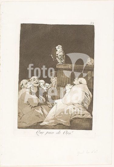 alb4142689 What a Golden Beak!, plate 53 from Los Caprichos. Francisco José de Goya y Lucientes; Spanish, 1746-1828. Date: 1797-1799. Dimensions: 193 x 136 mm (image); 216 x 151 mm (plate); 301 x 207 mm (sheet). Etching and aquatint on ivory laid paper. Origin: Spain. Museum: The Chicago Art Institute, USA.