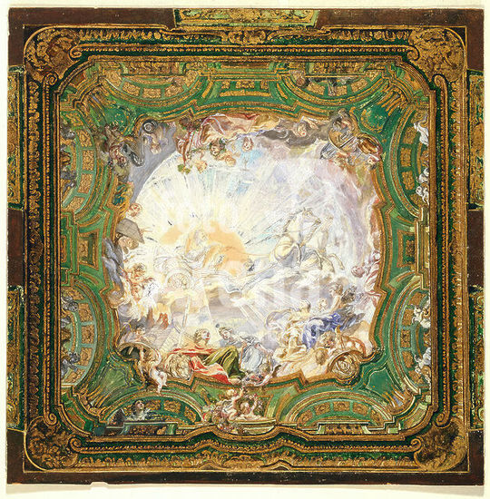 alb9528812 The central area is taken up with simulated sky with the chariot of Apollo. Around the edges, allegorical figures seated on clouds; simulated architecture of vaults and pendentives about the outer edges, within an architectural frame. Date: 1734. Pen and gray ink, brush and watercolor, gouache, gold paint, black chalk on white laid paper. Museum: Cooper Hewitt, Smithsonian Design Museum.
