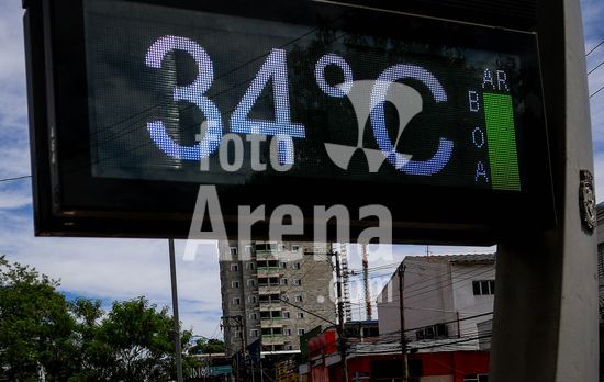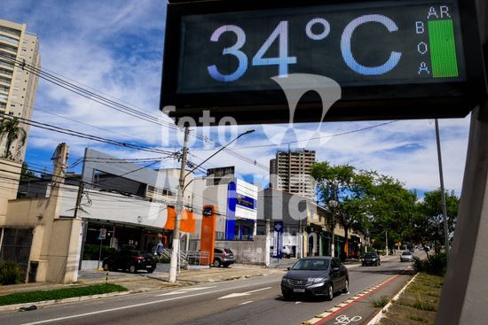 2867717 A semana começou abafada. Nesta segunda-feira (12), o sol favoreceu a rápida elevação das temperaturas, com máximas acima dos 33 °C e índices de umidade próximos dos 30%. Na imagem, relógio marca 34 °C na Avenida Corifeu de Azevedo Marques, no Jaguaré, zona oeste da capital paulista.