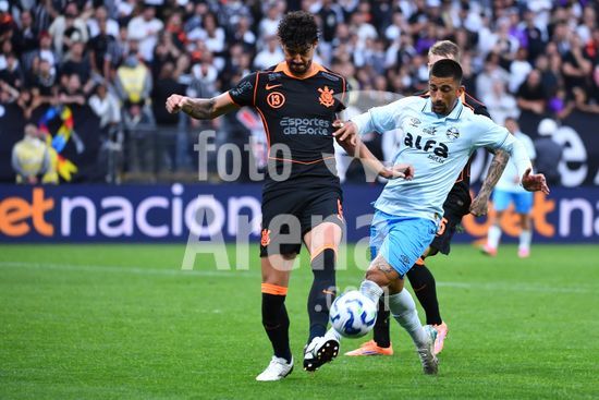 2834798 Cristian Olivera do Grêmio (Esquerda) e Ryan Gustavo do Corinthians (Direita) disputam a bola, durante partida entre Corinthians x Grêmio, válida pela trigésima primeira roda do Campeonato Brasileiro de Futebol 2025, neste domingo (2), na Neo Química Arena, SP.