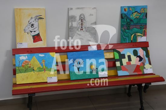2748776 Exposição de quadros, obras de arte produzidas por alunos de um colégio particular em Campo Mourão, na Região Centro-Oeste do Paraná.