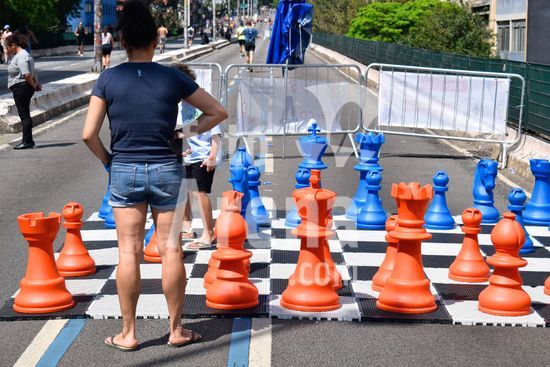 2811489 Minhocão. Lazer e atividade física no centro da cidade. Elevado Presidente João Goulart, chamado também de Parque Municipal do Minhocão. Fechado para lazer aos domingos e feriados, é um local de turismo para residentes e turistas. Antigo Elevado Costa e Silva. Na foto, jogo de xadrez com peças gigantes.
