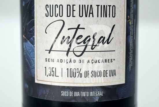 2817526 Alimentação saudável. Still. Embalagem de suco de uva integral de 1,35 litro. Uva. Bebida. Rótulo.