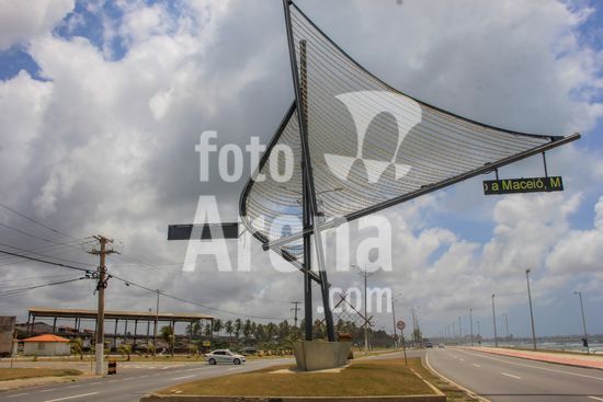 2825131 Objetos representativos do bairro do Pontal da Barra, jangada e uma tela de filé. Entrada do bairro e da cidade de Maceió, AL 101 Sul, Avenida Assis Chateaubriand