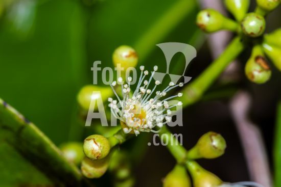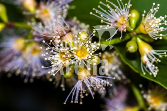 2832728 Floração do jamboloeiro (Syzygium cumini), uma árvore de grande porte originária da Índia e do Sudeste Asiático, mas amplamente cultivada e adaptada em diversas regiões do Brasil, em uma sítio na cidade de Marília, SP. Observam-se os ramos repletos de inflorescências, que são conjuntos de pequenas flores brancas e perfumadas. Cada flor é caracterizada por seus numerosos e longos estames, que conferem um aspecto plumoso e delicado ao conjunto. Ao lado das flores abertas, notam-se também diversos botões florais verdes, indicando diferentes estágios de desenvolvimento. As folhas grandes, de um verde intenso e brilhante, complementam a cena, destacando a vitalidade da planta. O jambolão é conhecido por seus frutos arroxeados e comestíveis e possui relevância tanto na arborização urbana quanto na medicina popular.
