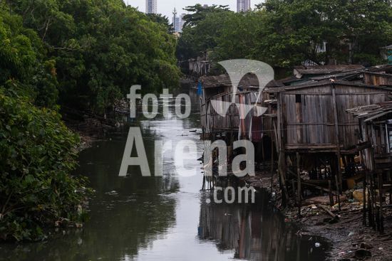 2832808 Palafitas às margens do Rio Tucunduba em Belém no Pará. Quase metade da população brasileira sofre com falta de saneamento básico. Cerca de 102 milhões de brasileiros moram em áreas sem água potável, sistema de esgotos ou coleta regular de lixo.