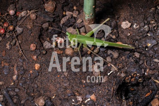 2835311 Um gafanhoto-folha, também conhecido como esperança, é visto em um registro fotográfico detalhado sobre o solo. Este inseto pertence à ordem Orthoptera e é conhecido por sua impressionante capacidade de camuflagem, com seu corpo verde e formato de asa que imitam perfeitamente uma folha, protegendo-o de predadores. Com suas longas antenas, ele explora o ambiente em busca de alimento, que consiste principalmente em plantas. Gafanhotos desempenham um papel vital no ecossistema, servindo como fonte de alimento para uma variedade de animais, como pássaros, répteis e mamíferos. Esta imagem é um excelente recurso para ilustrar conceitos de biologia, como mimetismo, adaptação e a diversidade da fauna brasileira em materiais didáticos e reportagens sobre o meio ambiente.