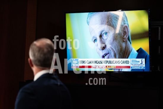 ny020426115312 Senate Majority Leader John Thune (R-S.D.) glances over as his face is shown on a video monitor at the Capitol in Washington displaying news coverage of the spending impasse on Thursday, April 2, 2026. The Senate on Thursday sent a bipartisan funding deal to reopen the Department of Homeland Security back to the House, which convened for a two-minute session and took no action to pass it. (Tierney L. Cross/The New York Times/Fotoarena)