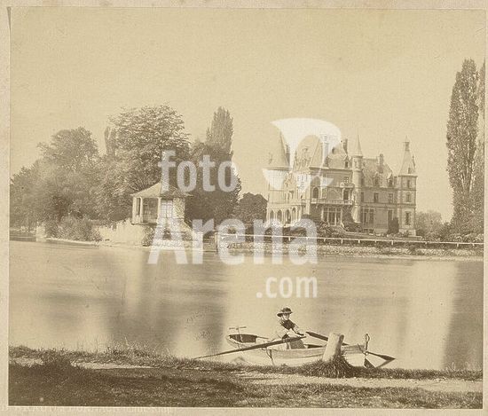 alb15589687 View of Schloss Schadau on Lake Thun, in the foreground a woman in a rowing boat, photograph, anonymous, publisher: Adolphe Braun & Cie., (mentioned on object), Thun, publisher: Dornach, 1860 - 1866, paper, albumen print, height, 159 mm × width, 189 mm, height, 200 mm × width, 252 mm.