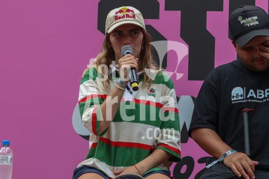 2452798 O Stu Open Rio 2023 realizou na manhã desta quinta-feira (26) uma Coletiva de Imprensa com os principais nomes do skate como Pamela Rosa, Rayssa Leal, Pedro Barros, Luigi Cini, Giovanni vianna, Yndiara Asp, o paraskatista Nando Araújo, e o australiano Keegan Palmer. O evento começa de hoje a domingo (29), na Praça do Uó na Barra da Tijuca. Na foto Pamela Rosa.