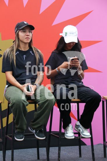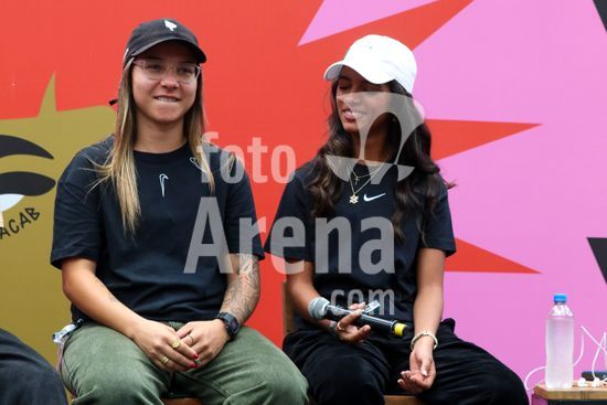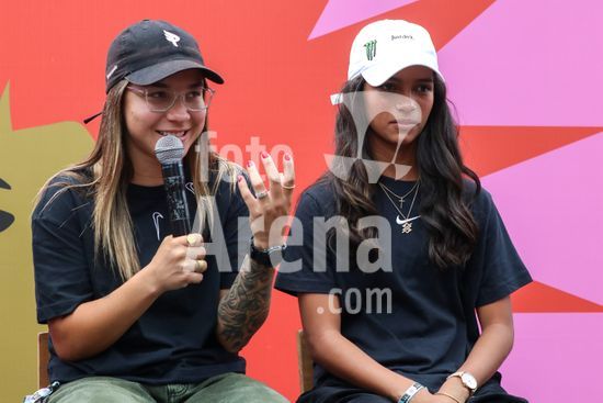 2452815 O Stu Open Rio 2023 realizou na manhã desta quinta-feira (26) uma Coletiva de Imprensa com os principais nomes do skate como Pamela Rosa, Rayssa Leal, Pedro Barros, Luigi Cini, Giovanni vianna, Yndiara Asp, o paraskatista Nando Araújo, e o australiano Keegan Palmer. O evento começa de hoje a domingo (29), na Praça do Uó na Barra da Tijuca. Na foto Pamela Rosa e Rayssa Leal.