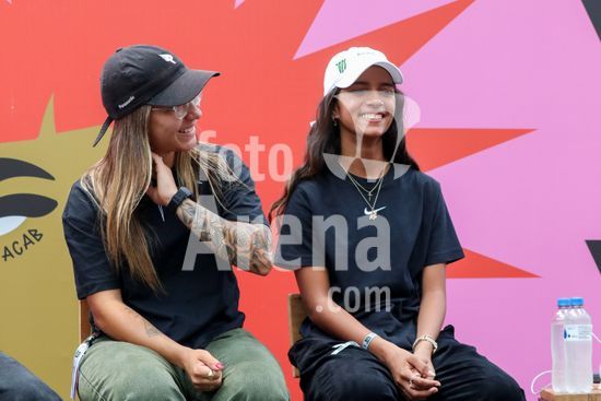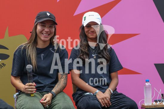 2452797 O Stu Open Rio 2023 realizou na manhã desta quinta-feira (26) uma Coletiva de Imprensa com os principais nomes do skate como Pamela Rosa, Rayssa Leal, Pedro Barros, Luigi Cini, Giovanni vianna, Yndiara Asp, o paraskatista Nando Araújo, e o australiano Keegan Palmer. O evento começa de hoje a domingo (29), na Praça do Uó na Barra da Tijuca. Na foto Pamela Rosa e Rayssa Leal.