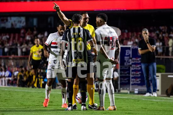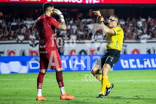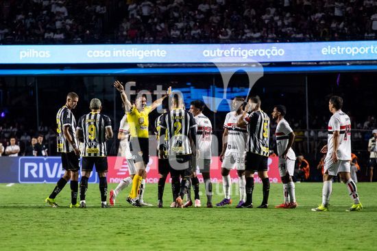 2877166 Gabriel Brazão recebe advertência do árbitro João Vitor Gobi durante a partida entre São Paulo e Santos, válida pela 6ª rodada do Paulistão, realizada na noite deste sábado (31) no MorumBIS em São Paulo, SP.