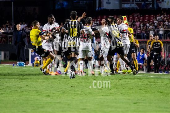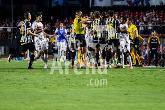 2877169 Discussão entre jogadores durante a partida entre São Paulo e Santos, válida pela 6ª rodada do Paulistão, realizada na noite deste sábado (31) no MorumBIS em São Paulo, SP.