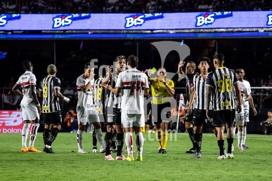2877155 Miguelito recebe cartão amarelo pelo árbitro João Vitor Gobi durante a partida entre São Paulo e Santos, válida pela 6ª rodada do Paulistão, realizada na noite deste sábado (31) no MorumBIS em São Paulo, SP.