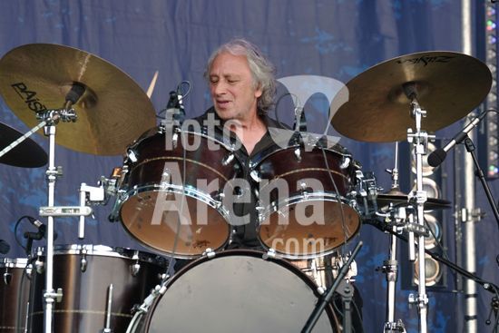 55222702 Pierre van der Linden, drummer with Dutch progressive rock band Focus, best known for their hits "Hocus Pocus", "House of The King" and "Sylvia" performing live on stage at Fairport's Cropredy Convention. Focus formed in The Netherlands in the 1970s. The current line up - Thijs van Leer - Hammond-organ -flute and vocals, Pierre van der Linden - drums, Menno Gootjes- guitar, Udo Pannekeet - bass. Photo Credit: Dawn Fletcher-Park / SOPA Images/ Sipa USA/ Fotoarena