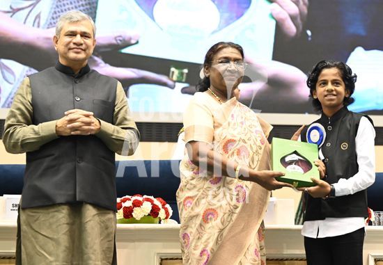 56507920 NEW DELHI, INDIA - OCTOBER 8: President Droupadi Murmu, Union Minister of Information and Broadcasting Ministry of Railways Ashwini Vaishnaw, present Best Child artist Sreepath PK for film Malikappuram during the 70th National Film Awards, 2022 at Vigyan Bhawan on October 8, 2024 in New Delhi, India. Photo Credit: Hindustan Times/ Sipa USA/ Fotoarena