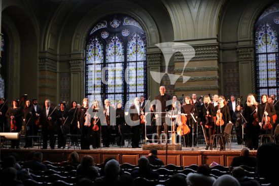 59494939 The National Odessa Philharmonic Orchestra seen during a performance at the Odessa Philharmonic Theater. The National Odessa Philharmonic Orchestra presented the concert program "Love The Best". The leading soloists of the Odessa Opera Bohdan Panchenko (baritone) and Maryna Naimytenko (soprano) sang. The conductor was Honored Artist of Ukraine Chernetski Igor. This is the first concert in the large hall of the Odessa Philharmonic Theater after its renovation following the missile attack on Odessa on 31.01.2025. Photo Credit: Viacheslav Onyshchenko / SOPA Images/ Sipa USA/ Fotoarena