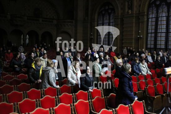 59494945 Spectators stand to listen to the Ukrainian anthem before the performance of the National Odessa Philharmonic Orchestra at Odessa Philharmonic Theater. The National Odessa Philharmonic Orchestra presented the concert program "Love The Best". The leading soloists of the Odessa Opera Bohdan Panchenko (baritone) and Maryna Naimytenko (soprano) sang. The conductor was Honored Artist of Ukraine Chernetski Igor. This is the first concert in the large hall of the Odessa Philharmonic Theater after its renovation following the missile attack on Odessa on 31.01.2025. Photo Credit: Viacheslav Onyshchenko / SOPA Images/ Sipa USA/ Fotoarena