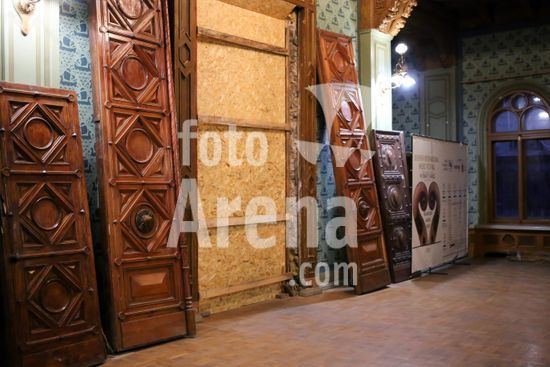 59494951 Wooden structures seen at the entrance door due to the rocket attack on the Russian Federation in the Odessa Philharmonic Theater. The National Odessa Philharmonic Orchestra presented the concert program "Love The Best". The leading soloists of the Odessa Opera Bohdan Panchenko (baritone) and Maryna Naimytenko (soprano) sang. The conductor was Honored Artist of Ukraine Chernetski Igor. This is the first concert in the large hall of the Odessa Philharmonic Theater after its renovation following the missile attack on Odessa on 31.01.2025. Photo Credit: Viacheslav Onyshchenko / SOPA Images/ Sipa USA/ Fotoarena
