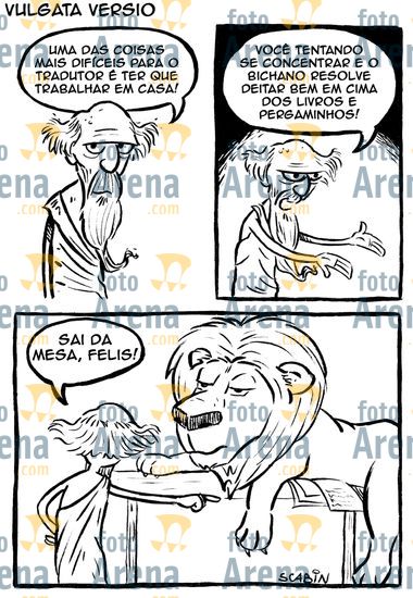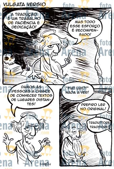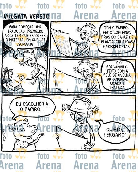 RAFAEL SCABIN. Publicado nas redes sociais em 17.09.2025.DiálogoVulgata Versio.- Para começar uma tradução, primeiro você tem que escolher o material em que vai escrever! Tem o papiro, feito com finas tiras do caule de planta, cruzadas e sobrepostas, e o pergaminho, feito com a pele de ovelha, arrancada, lixada e tratada!- Eu escolheria o papiro...- Quieto, Pergamo!