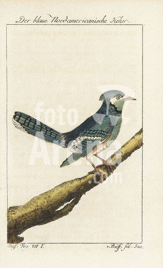 alb18721733 Blue jay, Cyanocitta cristata. Der blaue Nordamericanische Heher, le Geai bleu de l'Amerique septentrionale, Blew jay, Garrulus canadensis caeruleus, Corvus cristatus. Handcoloured copperplate engraving after an illustration by François-Nicolas Martinet from Bernhard Christian Otto's edition of Comte de Buffon's Naturgeschichte der Vogel, Natural History of Birds, Ben Joachim Pauli, Berlin, 1781.