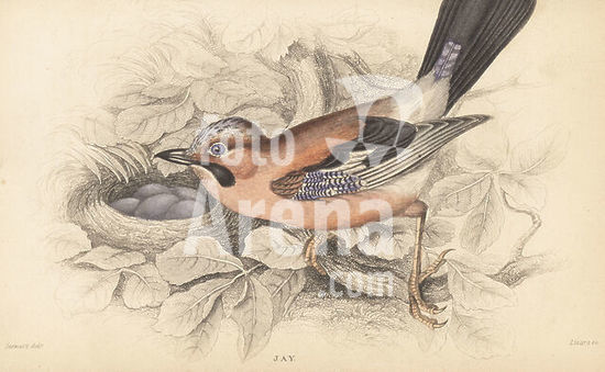 alb18730175 Eurasian jay or European jay, Garrulus glandarius. With nest and five blue eggs. Handcoloured steel engraving by William Lizars after an illustration by James Stewart from Sir William Jardine's Ornithology, British Birds, Incessores, Vol. XXV of The Naturalist's Library, W.H. Lizars, Edinburgh, 1843.