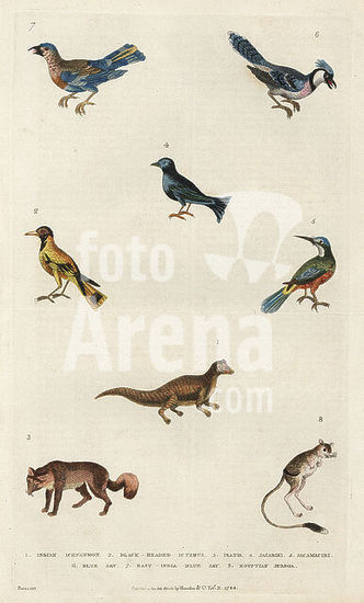 alb18731527 Indian grey mongoose, Urva edwardsii 1, Audubon's oriole, Icterus graduacauda 2, Arctic fox, Vulpes lagopus 3, blue-black grassquit, Volatinia jacarina 4, rufous-tailed jacamar, Galbula ruficauda 5, blue jay, Cyanocitta cristata 6, Indian roller, Coracias benghalensis 7, and Egyptian jerboa, Jaculus orientalis 8. Handcoloured copperplate engraving by Moses Harris from William Frederic Martyn's A New Dictionary of Natural History, Harrison, London, 1785. Pseudonym of William Fordyce Mavor, Scottish priest, teacher and writer, 1758-1837.
