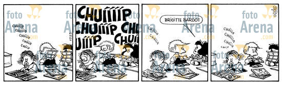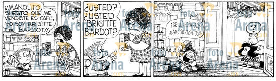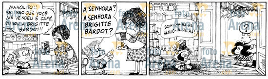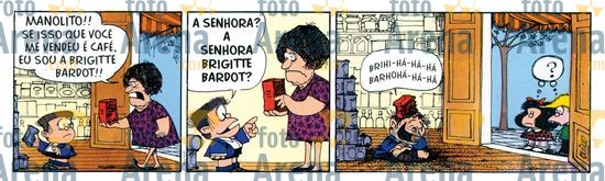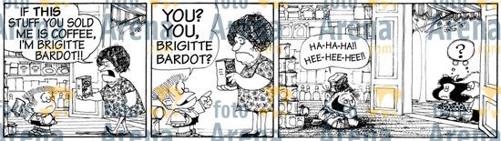 TIRA MAFALDA, CÓDIGO ORIGINAL 1873, PORTUGUES, EDIÇÕES MARTINS FONTES.DiálogoMulher: Manolito!! Se isso que você me vendeu é café, eu sou a Brigitte Bardot!!Manolito: A senhora? A senhora Brigitte Bardot? HI HA HA HA HA!As tiras da Mafalda, coloridas em português (com gramática atualizada), foram cedidas pela © Martins Editora Livraria Ltda. para licenciamento através da Fotoarena. Foram colorizadas pela editora Glénat.